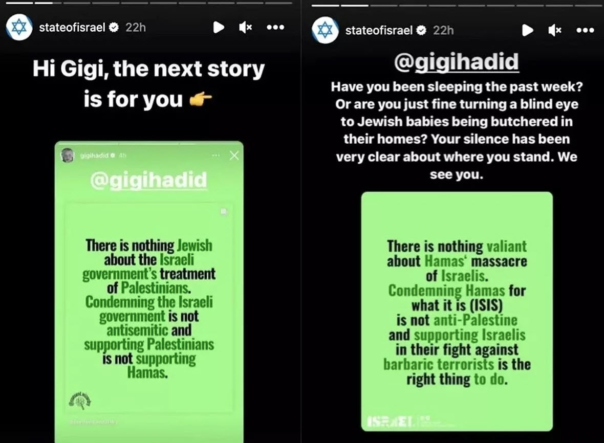 Filistin asıllı model Gigi Hadid, İsrail'in Gazze'deki katliamlarına sessiz kalamadı. Filistin'e destek mesajı yayınlayan model İsrail Hükümeti tarafında hedef alındı. "Bir haftadır rahat uyuyor musun Gigi? Ya da evlerinde katledilen Yahudi bebeklere gözünü mü kapıyorsun? Seni görüyoruz" ifadelerinin kullanıldığı paylaşıma birçok kullanıcı tepki gösterdi.