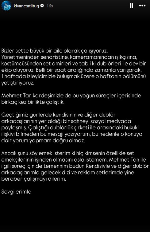 Kıvanç Tatlıtuğ, Aile dizisindeki dublörü Mehmet Tan'ın açıklamalarıyla gündeme geldi. Tatlıtuğ'un aksiyon sahnelerinde yer alan dublörü Tan, kamera arkası görüntülerini paylaştıktan sonra işten çıkarıldığını duyurmuştu. Yaşananların basına yansımasının ardından ünlü oyuncudan beklenen açıklama geldi.