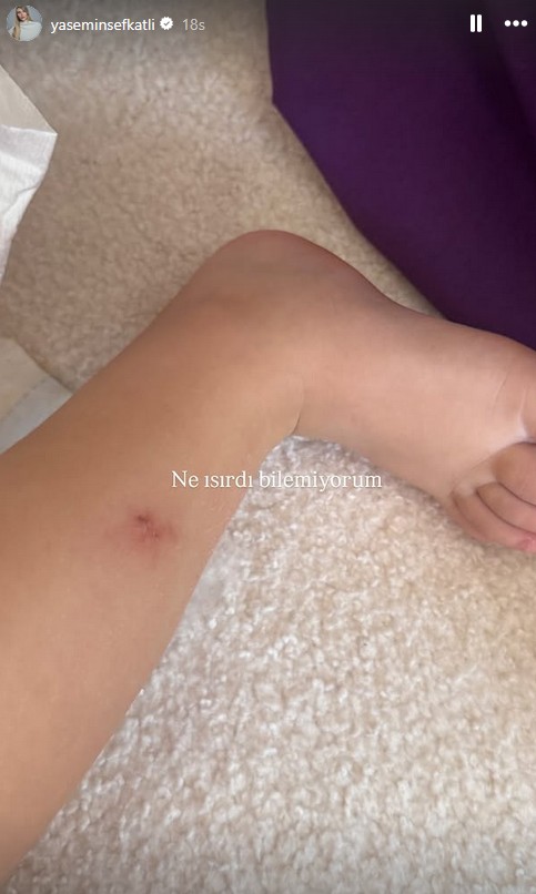 Oğullarını bir şeyin ısırdığını söyleyen Şefkatli, "Emir'in bacağını 3 gün önce bir şey ısırdı bahçede. Yara gibi oldu sürekli kaşınıyor. Bir de bu göğsünün üstü tek taraf sürekli kaşınıyor diye krem sürdüm.