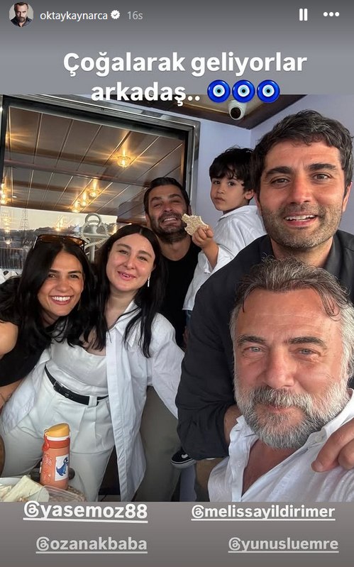 Dizide "Hızır Çakırbeyli" karakterine hayat veren Oktay Kaynarca, Yasemin Sakallıoğlu, Melissa Yıldırmer, Yunus Emre Yıldırımer ve Ozan Akbaba ile verdiği bir pozu "Çoğalarak geliyorlar arkadaş" notuyla yayınladı.