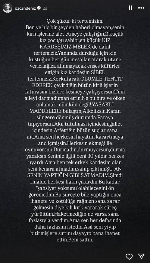 "Çok şükür tertemizim. Ben ve hiçbir şeyden haberi olmayan, senin kirli işlerine alet etmeye çalıştığın, 2 küçük kız çocuğu sahibi, en küçük kız kardeşimiz Melek de dahil tertemiziz. Yanımda durduğu için kin kustuğun, her gün mesajlar atarak utanç verici, ağza alınmayacak küfürler ettiğin kız kardeşim Sibel tertemiz. Korkutarak, ölümle tehdit ederek çevirdiğin bütün kirli işlerin faturasını bizlere kesmeye çalışıyorsun.
