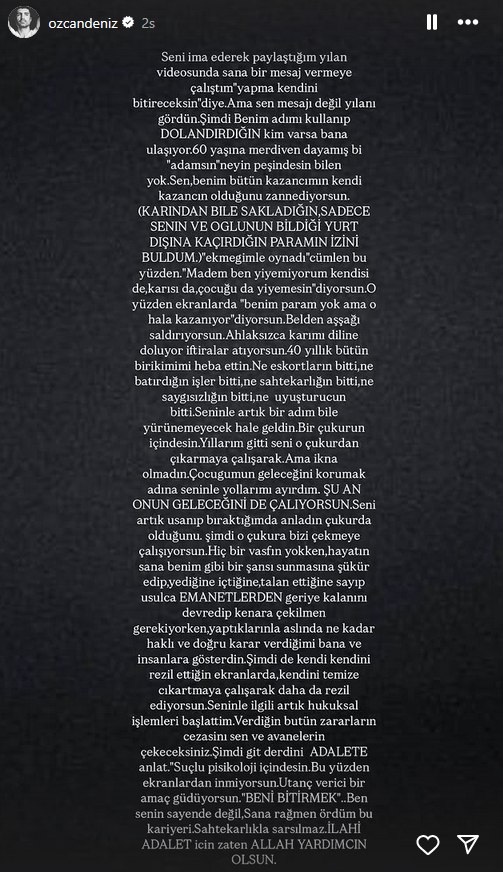 Ailesiyle yaşadığı sorunlarla magazin manşetlerinden düşmeyen Özcan Deniz, geçtiğimiz günlerde anjiyo oldu. Sağlığına kavuşan ünlü isim, şimdi ise sosyal medya hesabında yaptığı açıklamalarla gündeme geldi. "Tüm aileyi darmaduman ettin" diyen Deniz, abisi Ercan Deniz'e ağır suçlamalarda bulundu.