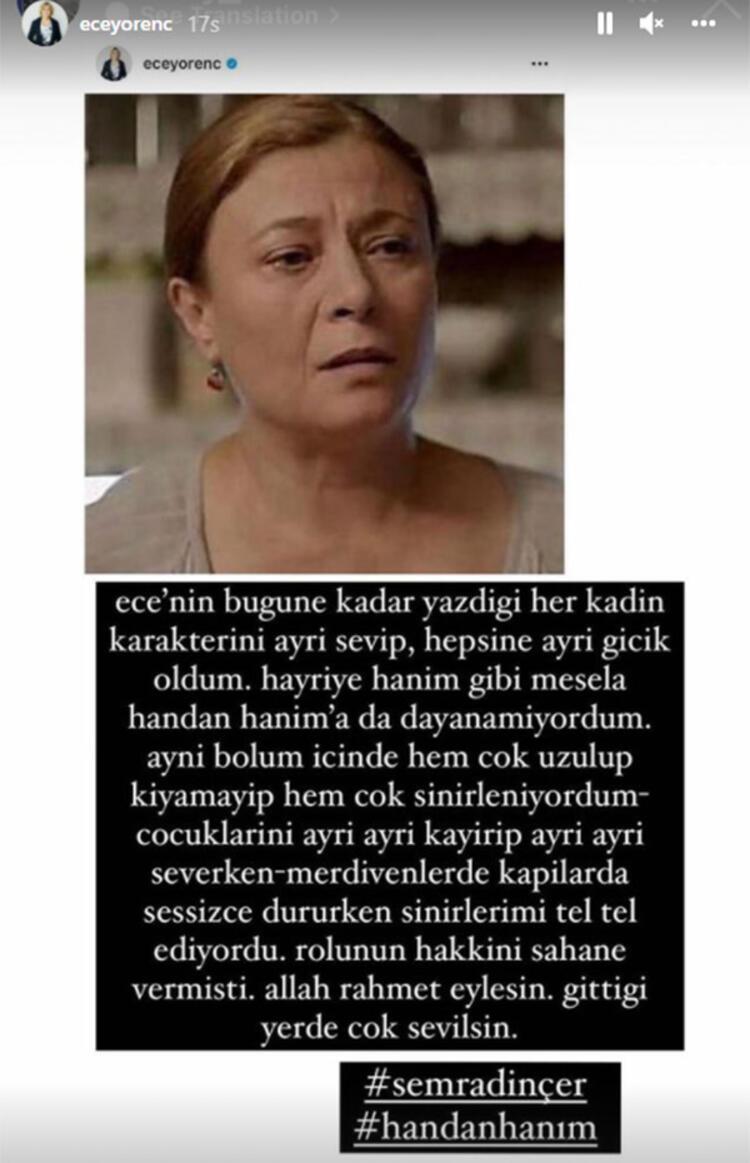 Sema Dinçer'in 'Handan Tekinoğlu' karakterine hayat verdiği 'Kuzey Güney' dizisinin senaristi Ece Yörenç, üzüntüsünü Instagram hesabı üzerinden dile getirdi: