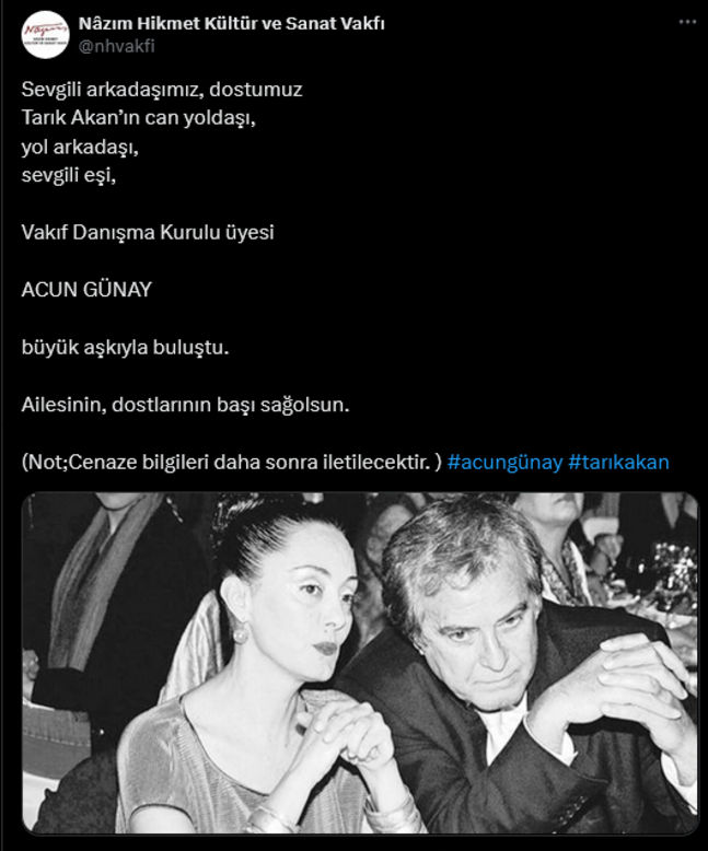 Paylaşımda "Tarık Akan'ın otuz yıllık eşi, bale sanatçısı Acun Günay'ı bugün sonsuzluğa uğurladık. Acımızı paylaşan tüm dostlara minnetle..." ifadeleri yer aldı.