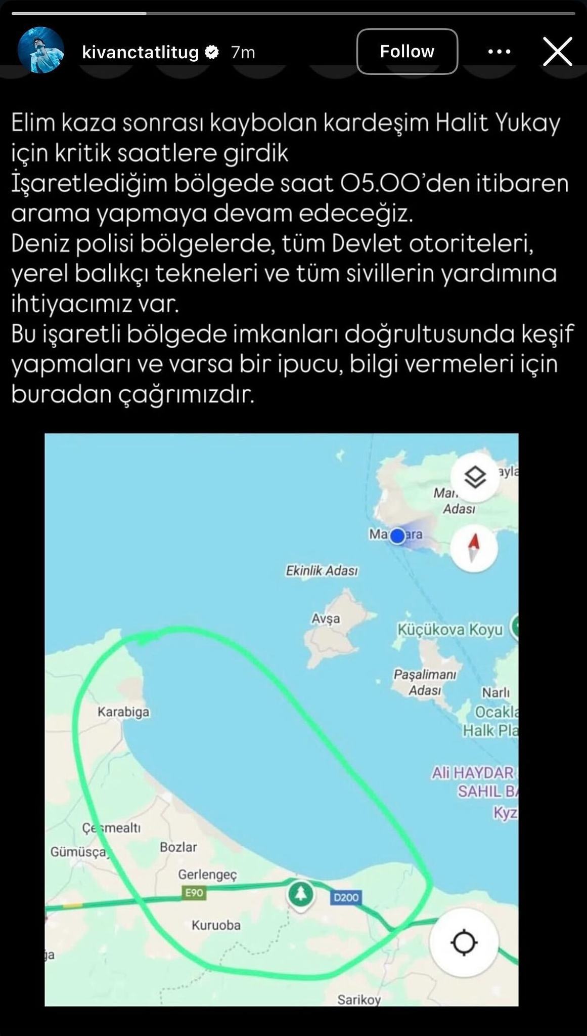 Marmara Denizi'nde günlerdir süren esrarengiz kayıp vakası, magazin dünyasında büyük yankı uyandırdı. Ünlü yat tasarımcısı Halit Yukay'dan haber alınamaması üzerine başlatılan arama kurtarma çalışmalarına yakın dostu Kıvanç Tatlıtuğ da katıldı. Ünlü oyuncu, sosyal medya hesabından yardım çağrısında bulundu.