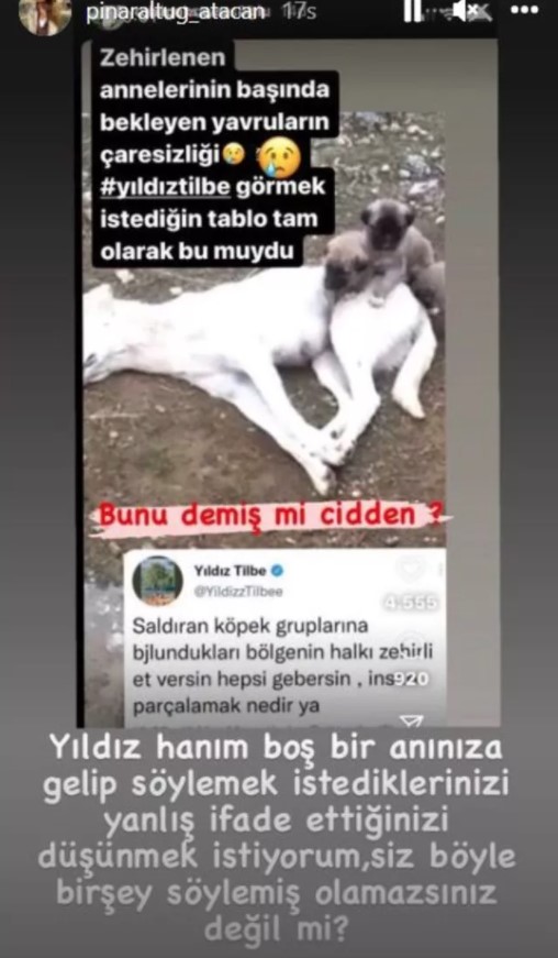 Ünlü şarkıcı Yıldız Tilbe'ye "Saldıran köpek gruplarına bulundukları bölgenin halkı zehirli et versin, hepsi gebersin!" ifadelerinden dolayı tepkiler çığ gibi büyüyor. Ünlü oyuncu Pınar Altuğ Tilbe'nin bu vicdan yoksunu sözlerine inanamadı ve bakın ne dedi.