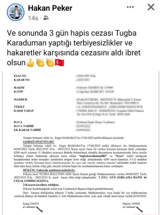 Peker, Tuğba Karaduman isimli saplantılı hayranının 3 gün hapis cezası aldığı karar yazısını paylaşarak "Ve sonunda 3 gün hapis cezası Tuğba Karaduman yaptığı terbiyesizlikler ve hakaretler karşısında cezasını aldı ibret olsun" notuyla paylaştı.
