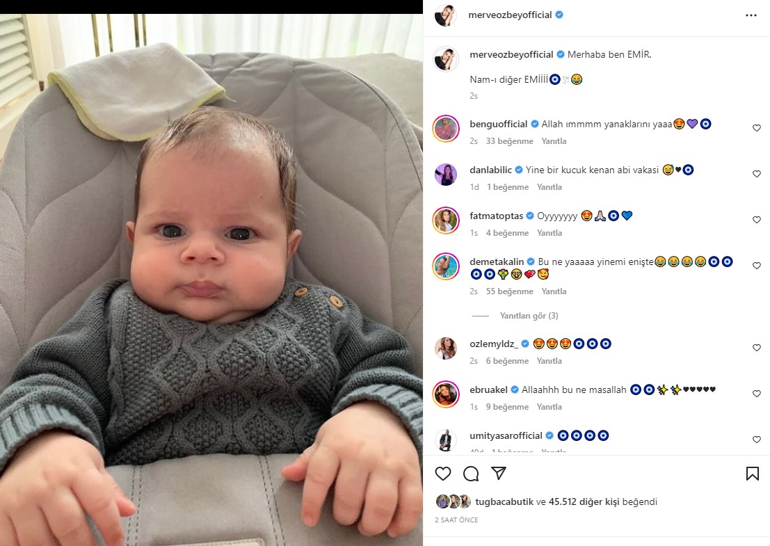 2 sene önce Kenan Koçak ile ihtişamlı bir düğünle evlenen ünlü şarkıcı Merve Özbey, geçen sene ilk çocuğu Elif Özüm'ü kucağına alarak annelik duygusunu tatmıştı. Geçen eylül ayında da 2. defa anne olmanın sevincini yaşayan Özbey, oğlu Emir'i doğurmuştu. Başarılı müzik kariyeri ve mutlu evliliğiyle düşman çatlatan Merve Özbey, son paylaşımıyla Instagram'ı yıktı geçti! Minik oğlu Emir'in yüzünü ilk defa takipçileriyle paylaşan şarkıcı, "Merhaba ben EMİR. Nam-ı diğer EMİİİİ" sözleriyle paylaştı. Bakın minik Emir kime benziyor?