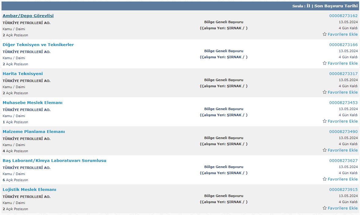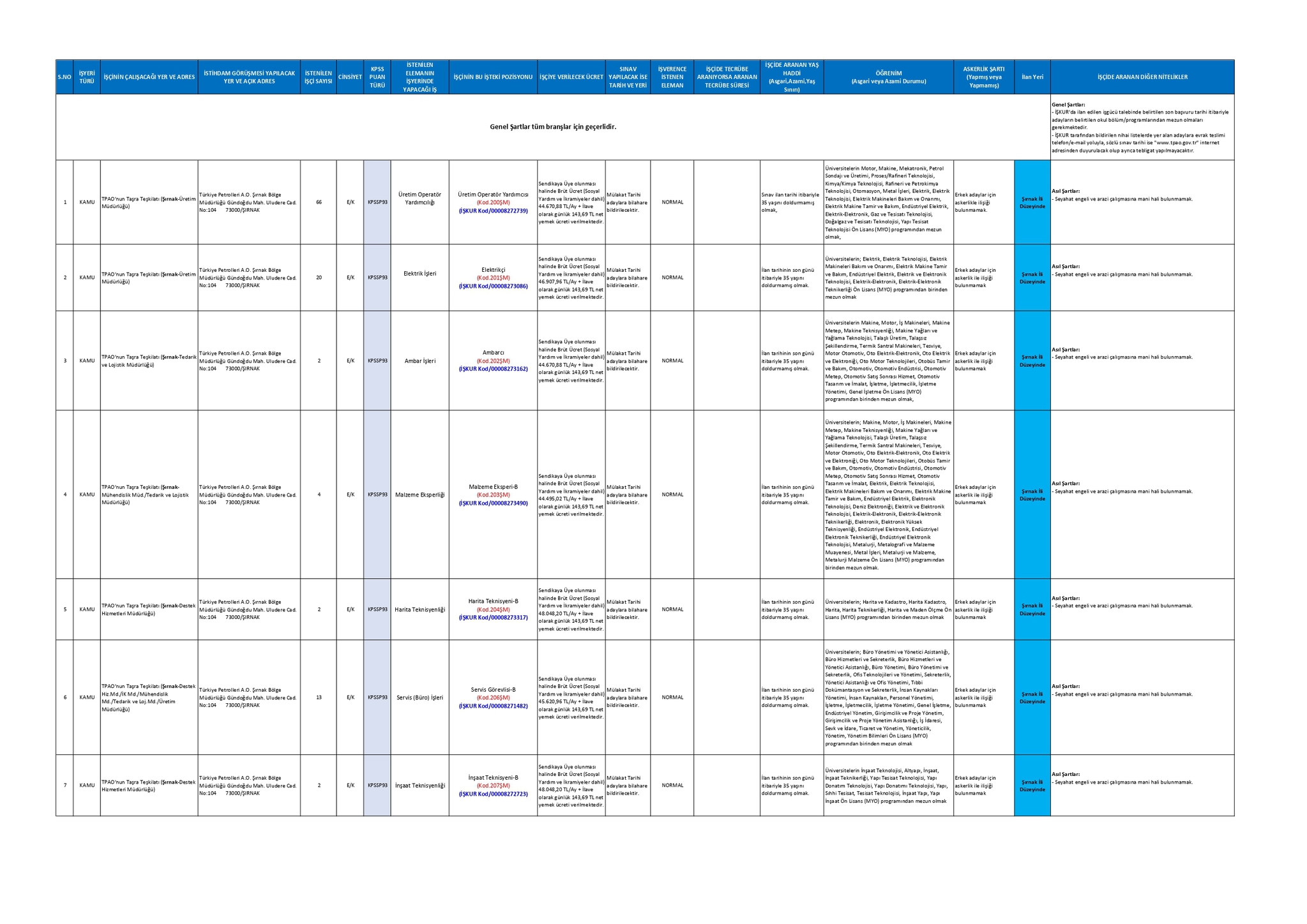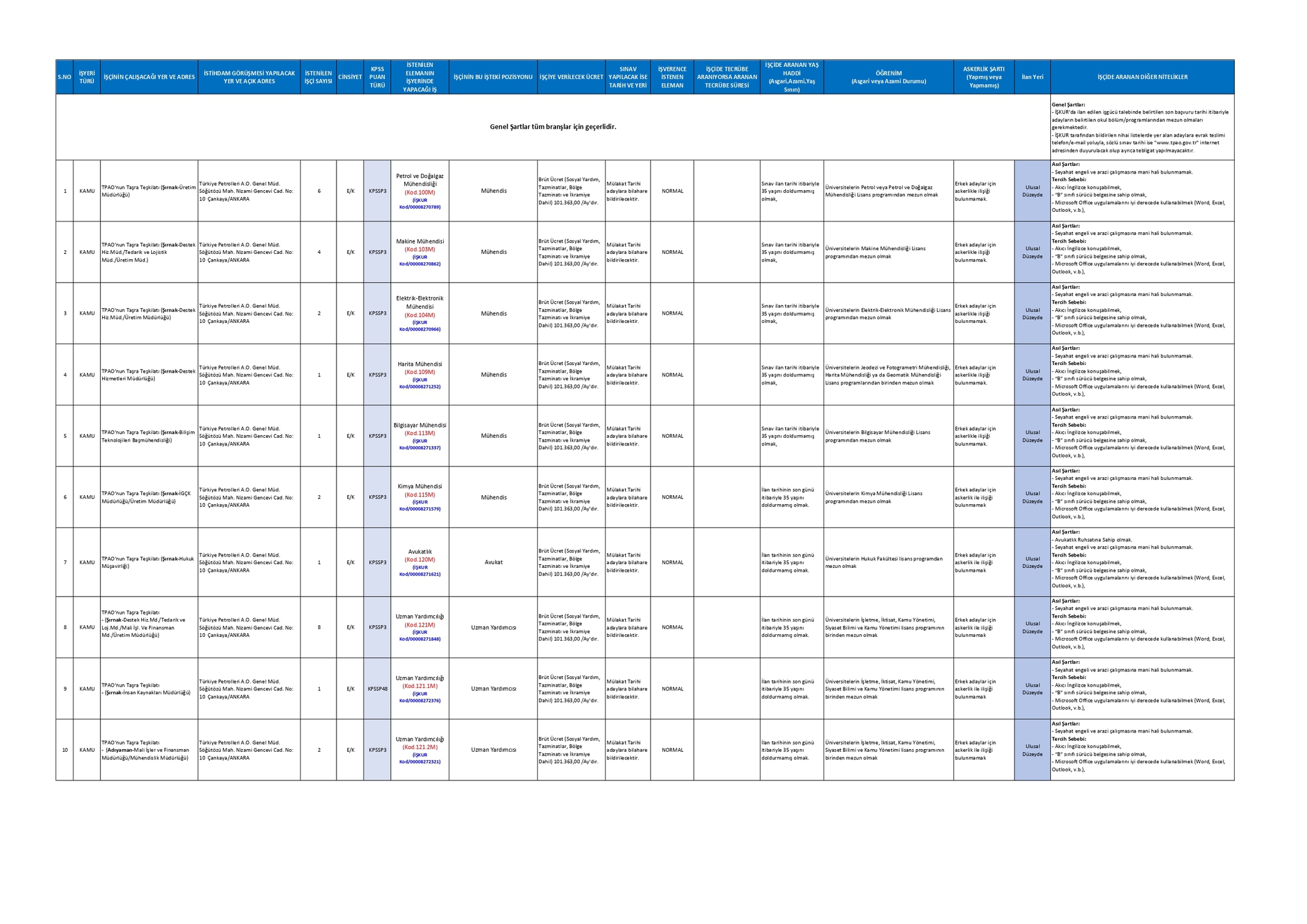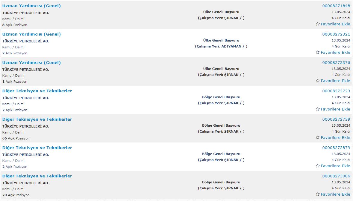 Türkiye Petrolleri Anonim Ortaklığı, Lisans ve Önlisans mezunu adaylar arasından 1 Harita Mühendisi, 1 Bilgisayar Mühendisi, 13 Büro Memuru (Genel), 2 Kimya Mühendisi, 1 Avukat, 11 Uzman Yardımcısı (Genel), 92 Diğer Teknisyen ve Teknikerler, 2 Ambar/Depo Görevlisi, 2 Harita Teknisyeni, 1 Muhasebe Meslek Elemanı, 4 Malzeme Planlama Elemanı, 6 Baş Laborant/Kimya Laboratuvarı Sorumlusu, 2 Lojistik Meslek Elemanı, 6 Petrol ve Doğal Gaz Mühendisi, 4 Makine Mühendisi, 2 Elektrik-Elektronik Mühendisi olmak üzere toplamda 150 personel alımı yapacağını açıkladı.