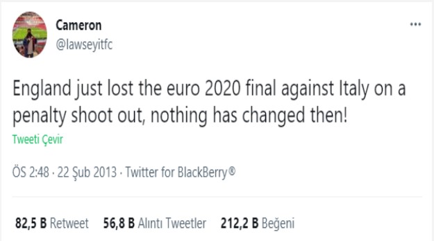22 Şubat 2013 tarihinde bir tweet atan İngiliz taraftarın, "İngiltere, EURO 2020'yi penaltı atışlarıyla İtalya'ya kaybetti. Sonrasında hiçbir şey değişmedi" ifadelerini kullandığı gün yüzüne çıktı.