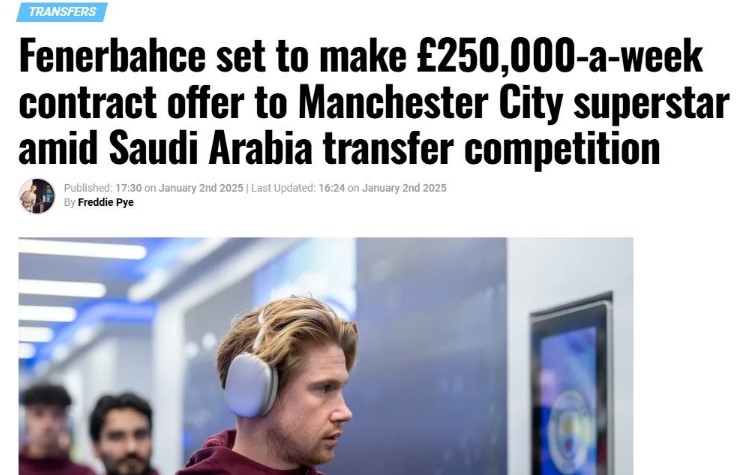 aspor.com.tr'nin haberine göre İngiliz basını Fenerbahçe'nin, Kevin De Bruyne'ye vergiler düştükten sona haftalık en az 250.000 sterlinlik sözleşme teklifinde bulunmaya hazırlandığı belirtti. Belçikalı yıldızın şu ana kadar yaşadığı sakatlık ve hastalık nedeniyle Manchester City'ye olan katkısının azaldığına dikkat çekildi.