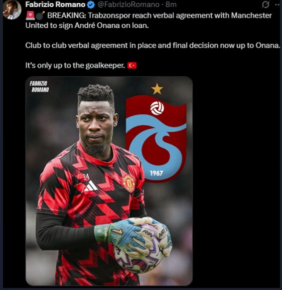 Fabrizio Romano'nun haberine göre Trabzonspor ve Manchester United yönetimi, Andre Onana'nın transferi için prensip anlaşmasına vardı.