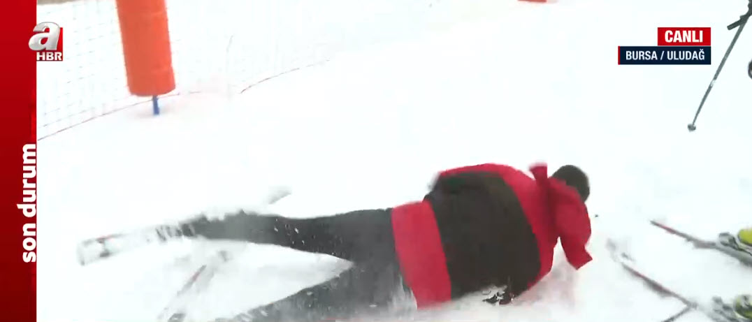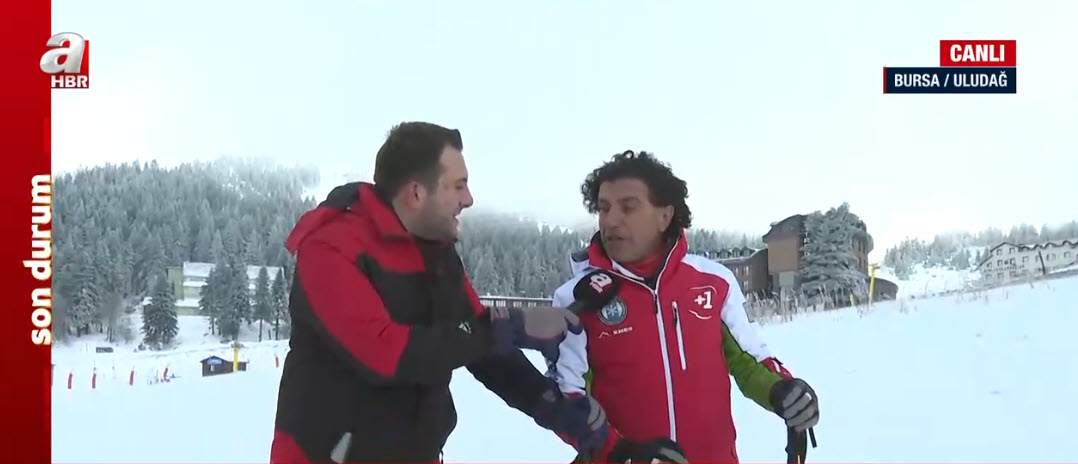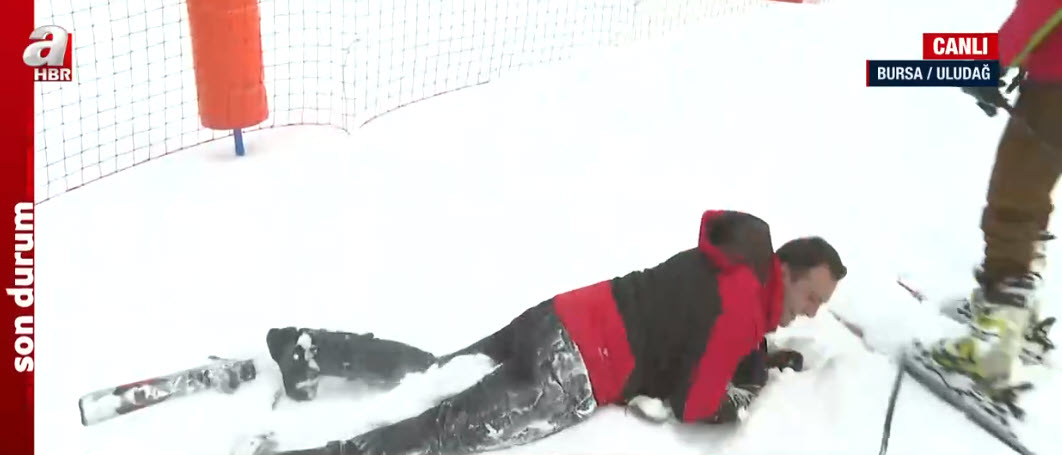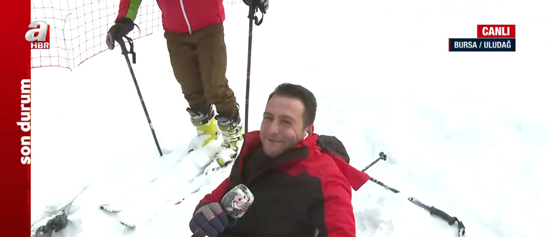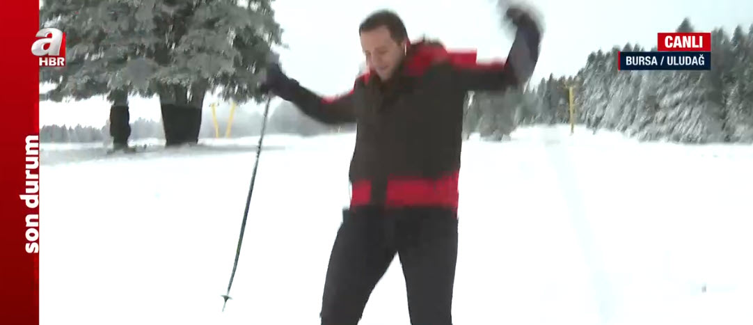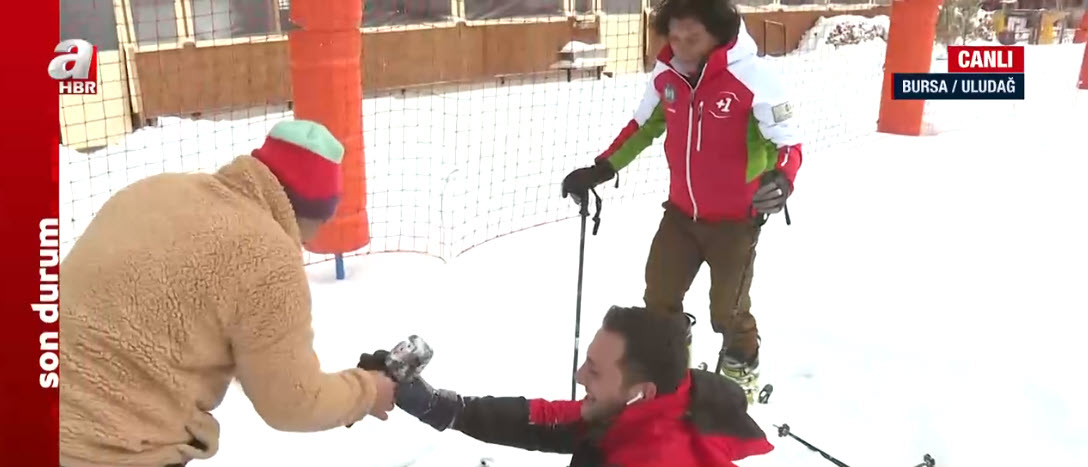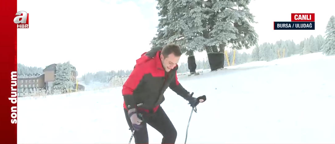 Kış turizminin gözde merkezlerinden Uludağ beyaza büründü. A Haber muhabiri Yusuf Gül, canlı yayında kayak deneyimi yaptığı sırada düştü. İşte o anlar…