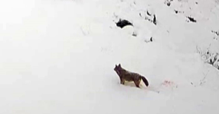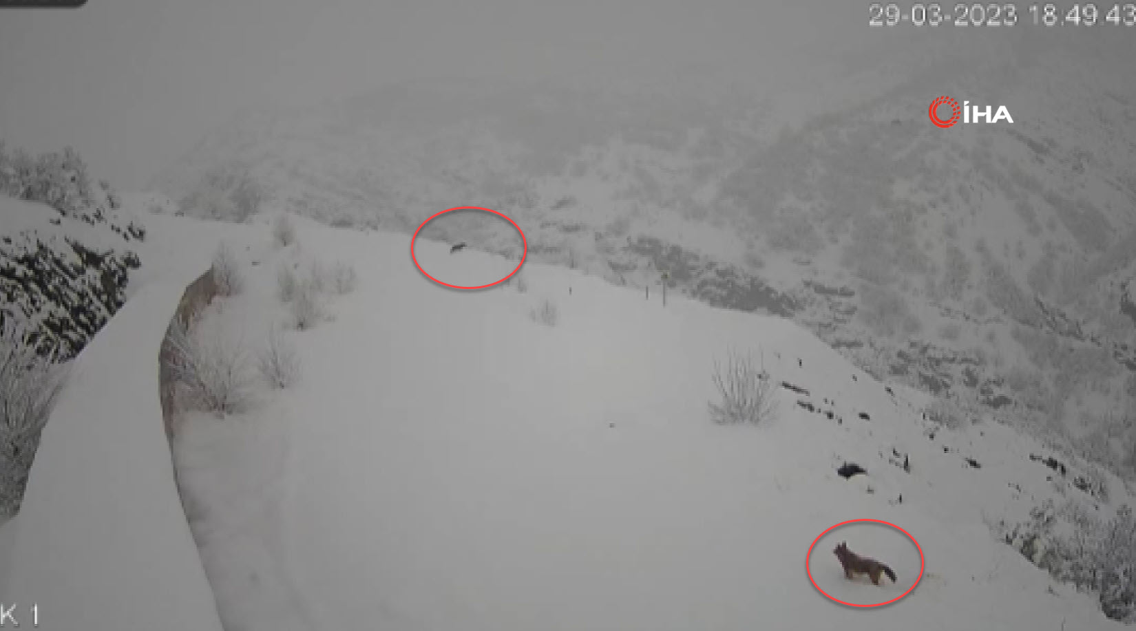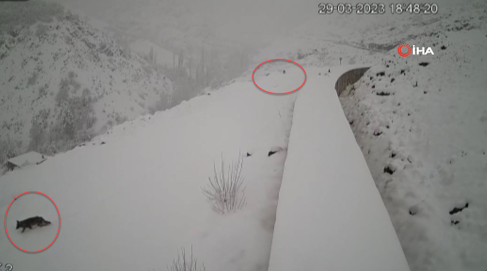 Geçtiğimiz günlerde etkili olan kar yağışı sonrası doğada yiyecek bulmakta zorluk çeken iki kurt köy yakınına kadar indi.