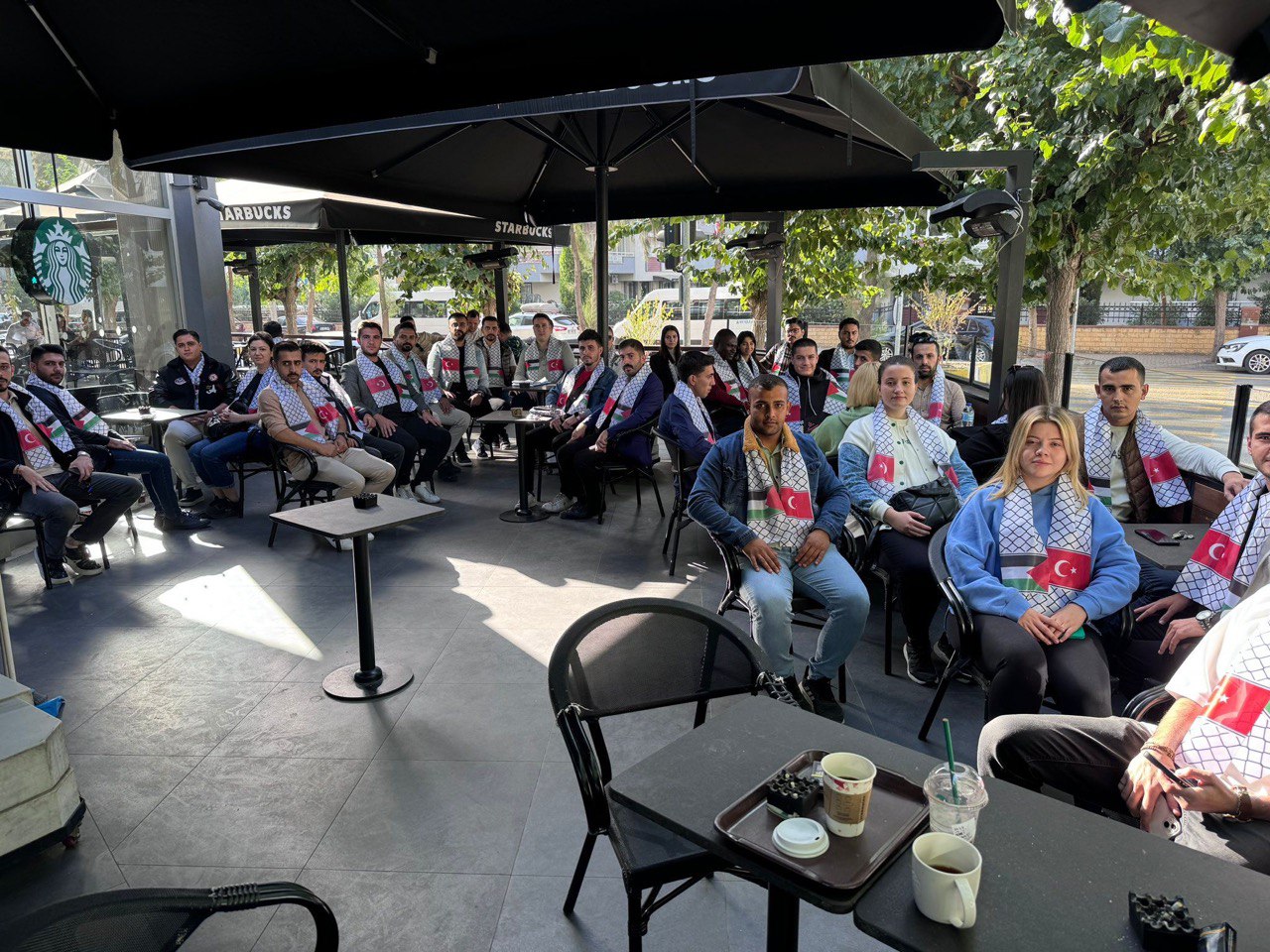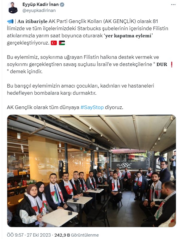 Filistin'de yaşanan soykırıma ve bu soykırımda Starbucks'ın İsrail'e verdiği desteğe tepki olarak AK Parti Gençlik Kolları mensubu 30.000'i aşkın genç, İsrail destekçisi Starbucks'ın Türkiye'deki tüm il ve ilçelerindeki şubelerinde misafir oturma alanlarında "Say Stop" mottosuyla, Filistin atkılarıyla yer kapatma eylemi gerçekleştirdi.