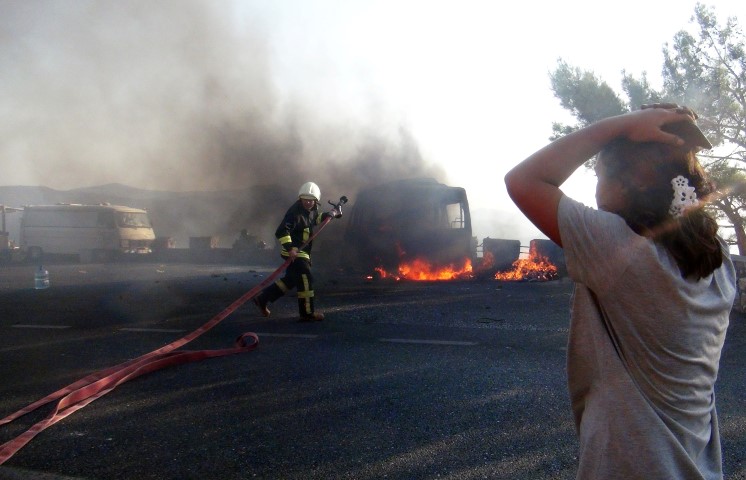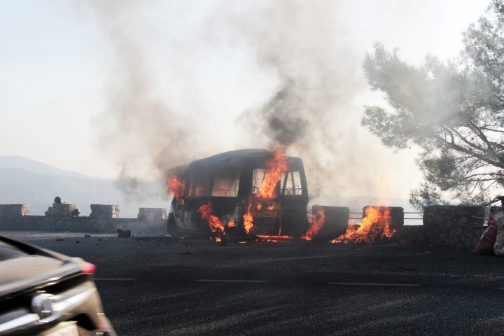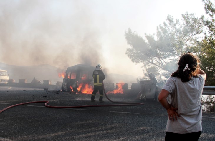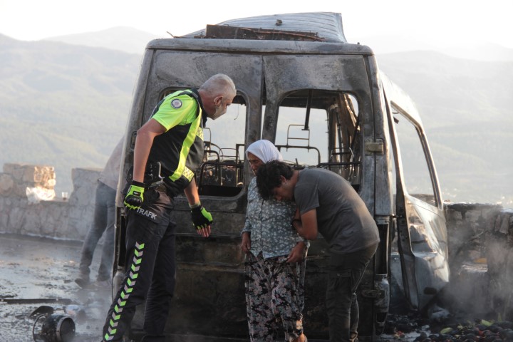 Son dakika haberi: Muğla'da Gökova Sakartepe rampasında park halinde bulunan ve yiyecek-içecek satışı yapan minibüs çıkan yangında tamamen yanarak kullanılmaz hale geldi. Küle dönen aracın seyir tepesinde duran araçlara yiyecek-içecek satışı yapan Cumhur Sarı'ya ait olduğu tespit edildi. Sarı, ekmek teknesinin alevler içinde kaldığı o anları ise gözyaşları içerisinde izledi.