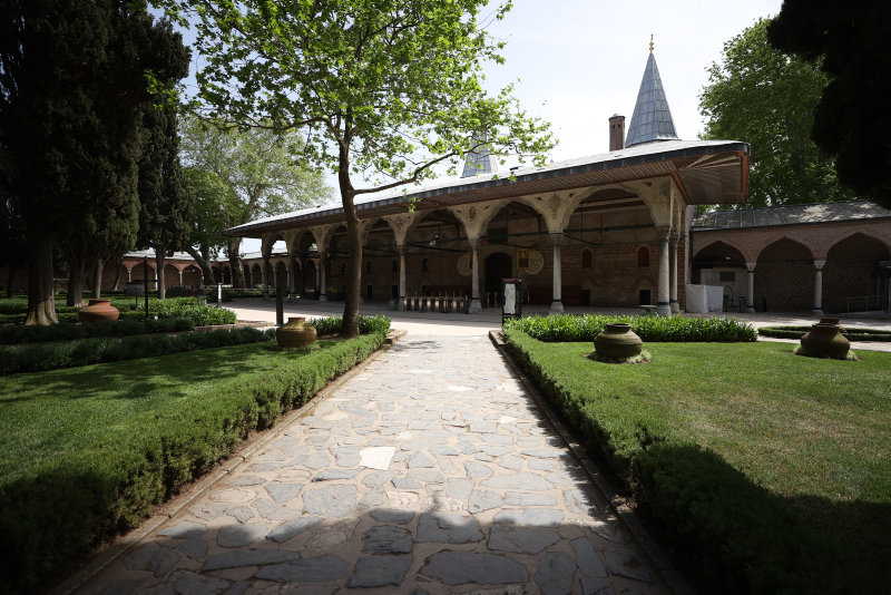 Dronenin sarayın giriş kapısından süzülerek kaydettiği görüntülerde, Alay Meydanı olarak da anılan ilk avluda Aya İrini Kilisesi, Darphane, Fırın, Hastane, Odun Ambarı ve Hasırcılar Ocağı yer aldı.