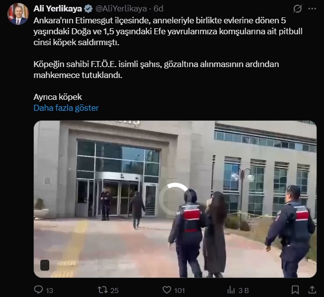 1,5 ve 5 yaşındaki iki kardeş evlerinin kapısının önünde pitbull cinsi köpeğin saldırısına uğradı. Baba Adem Öztürk, A Haber canlı yayınında dehşet anlarını Şener Çetin'e anlattı. Öztürk, "Bizim canımız yandı başkalarının canı yansın istemiyoruz" dedi. Bakan Yerlikaya köpeğin sahibinin tutuklandığını duyurdu. Ayrıca şahsın daha önce pitbull cinsi köpeğini site bahçesinde gezdirirken çekilen görüntüler ortaya çıktı.