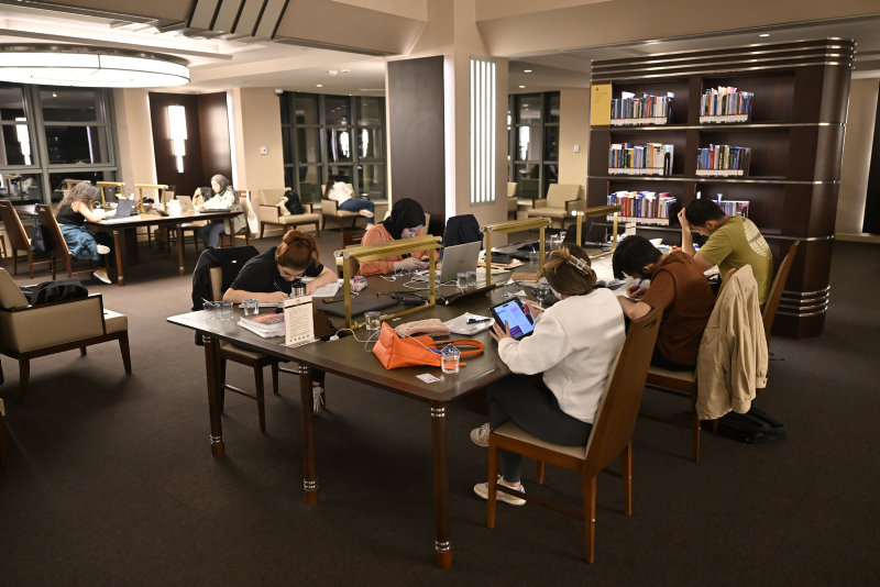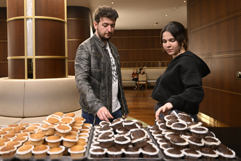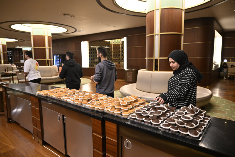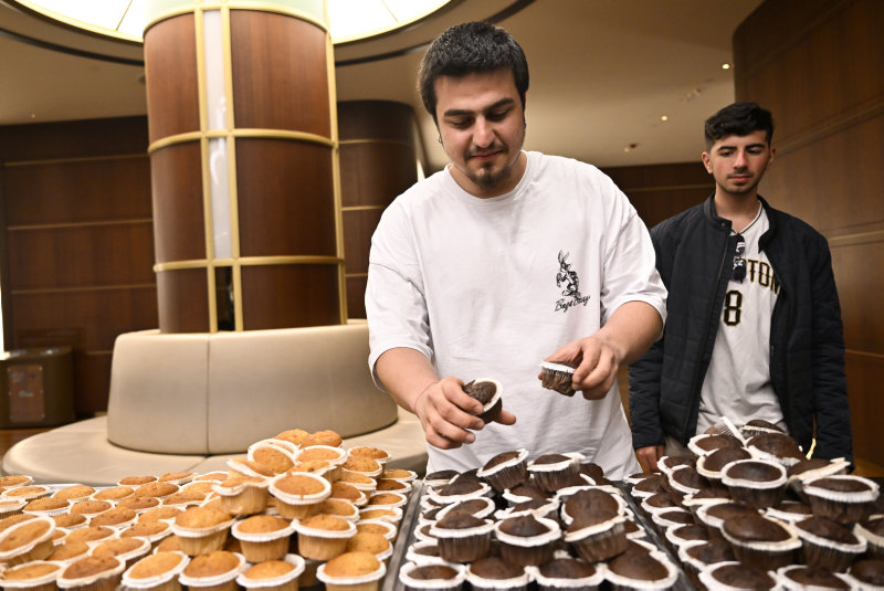 Gece saatlerinde de yoğun ilgi gören kütüphanede çalışanlara ücretsiz kek, çay, kahve ve su ikramında bulunuluyor.