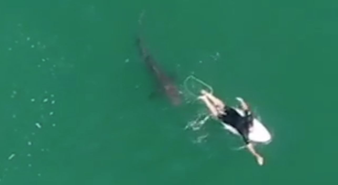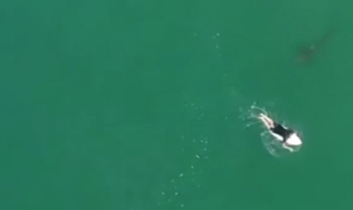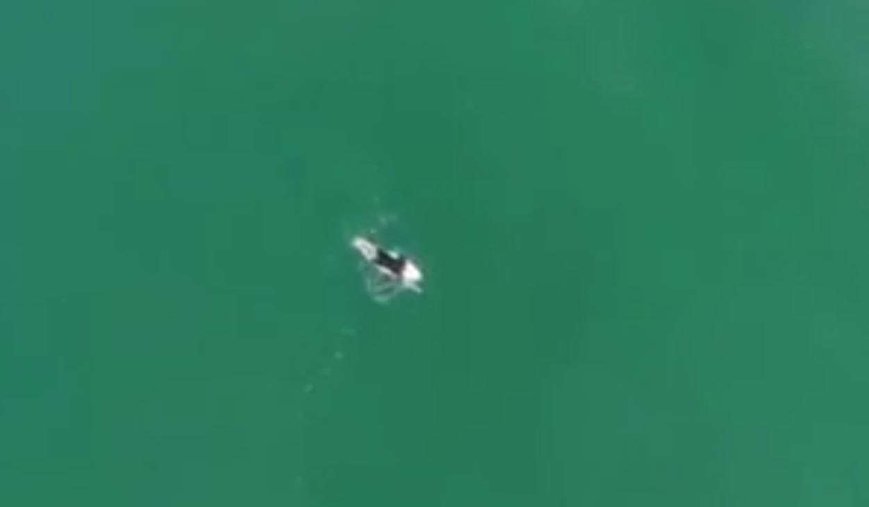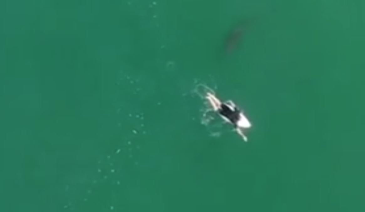 Wilkinson, kendisini takip eden yaklaşık 2.5 metre boyundaki dev köpek balığı, bölgede keşif yapan drone sayesinde fark edildi.