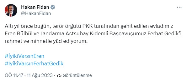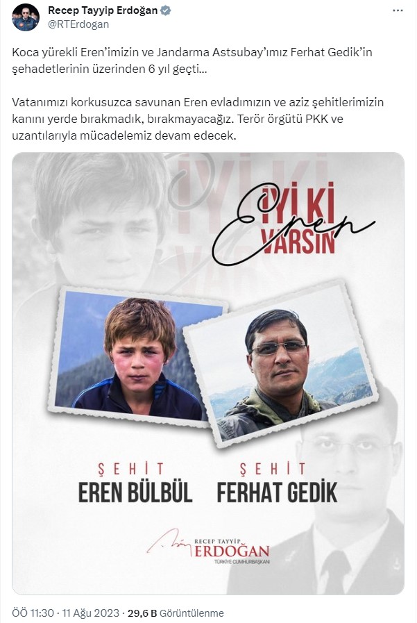 Trabzon'un Maçka ilçesi kırsalında 11 Ağustos 2017'de terör örgütü PKK'lı kalleşlerce şehit edilen Eren Bülbül ve Jandarma Astsubay Kıdemli Başçavuş Ferhat Gedik, şehadetlerinin 6. yılında anılıyor. Bülbül ve Gedik'in isimleri, hatıra ormanı ve tünel gibi çeşitli mekanlarda yaşatılıyor. Öte yandan Başkan Erdoğan, bugün bir paylaşım yaparak şehitlerimizi andı ve "Koca yürekli Eren'imizin ve Jandarma Astsubay'ımız Ferhat Gedik'in şehadetlerinin üzerinden 6 yıl geçti… Vatanımızı korkusuzca savunan Eren evladımızın ve aziz şehitlerimizin kanını yerde bırakmadık, bırakmayacağız. Terör örgütü PKK ve uzantılarıyla mücadelemiz devam edecek." ifadelerine yer verdi.