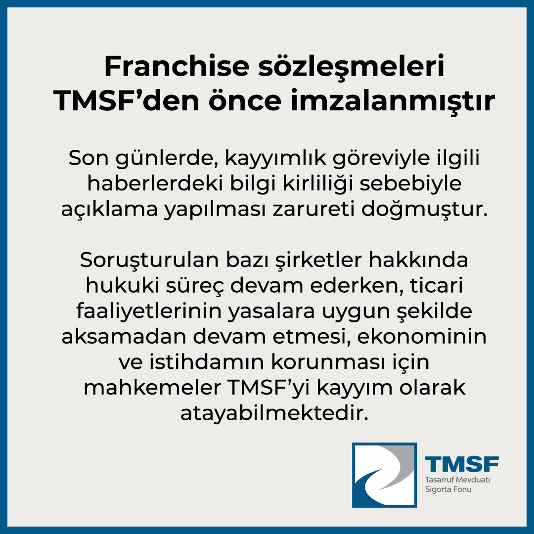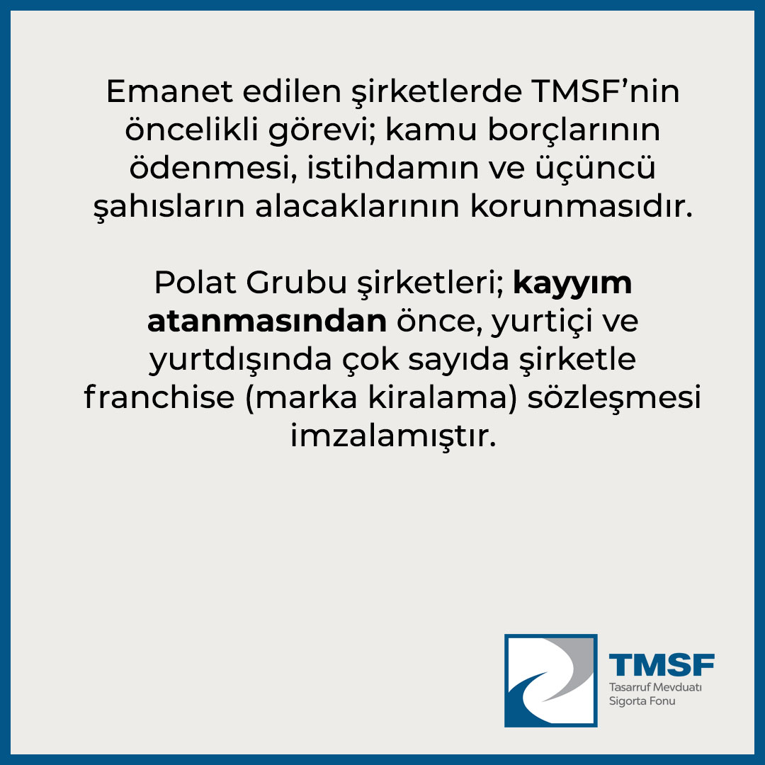 "Emanet edilen şirketlerde TMSF'nin öncelikli görevi, kamu borçlarının ödenmesi, istihdamın ve üçüncü şahısların alacaklarının korunmasıdır. Polat Grubu şirketleri, kayyım atanmasından önce, yurt içi ve yurt dışında çok sayıda şirketle franchise sözleşmesi imzalamıştır. Bu şekilde sözleşme imzalanan 100'ü aşkın şirketin sadece 5'i hakkında kayyımlık kararı bulunmaktadır.