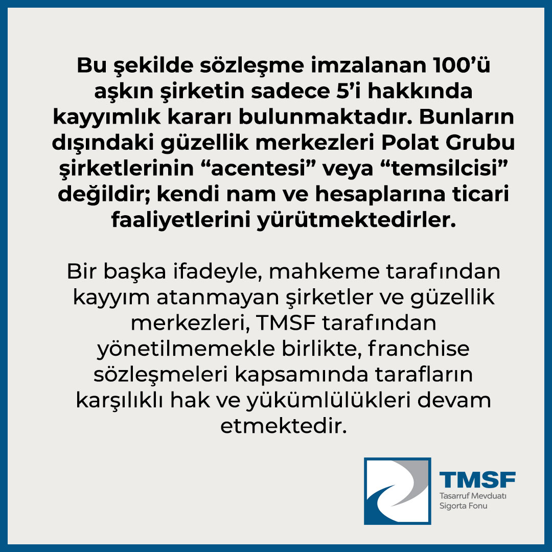 Bunların dışındaki güzellik merkezleri Polat Grubu şirketlerinin 'acentesi' veya 'temsilcisi' değildir, kendi nam ve hesaplarına ticari faaliyetlerini yürütmektedirler. Bir başka ifadeyle, mahkeme tarafından kayyım atanmayan şirketler ve güzellik merkezleri, TMSF tarafından yönetilmemekle birlikte franchise sözleşmeleri kapsamında tarafların karşılıklı hak ve yükümlülükleri devam etmektedir."