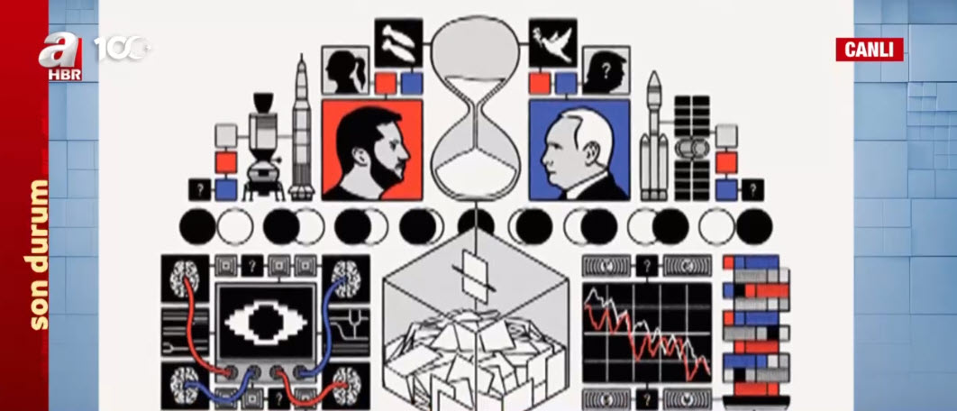 En üstte Zelenskiy ve Putin var. Ortada bir kum saati var. Çok çeşitli yorumlar var. Bir fal gibi bakılıyor bu işe...