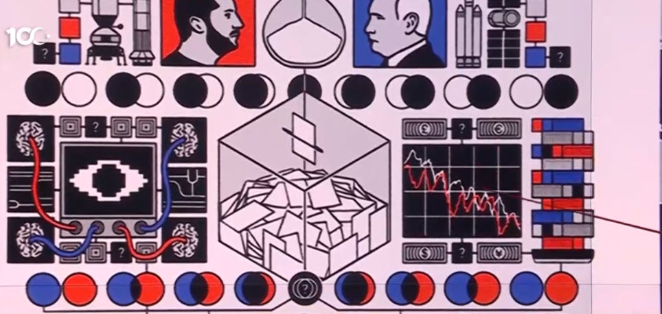 Euro, dolar, yen ve sterlinin düşüş grafiği var ekonomiyle ilgili. Xi Cing Ping var. Elektrikli otomobil var piller var. İklim değişikliği ile ilgili simge var.