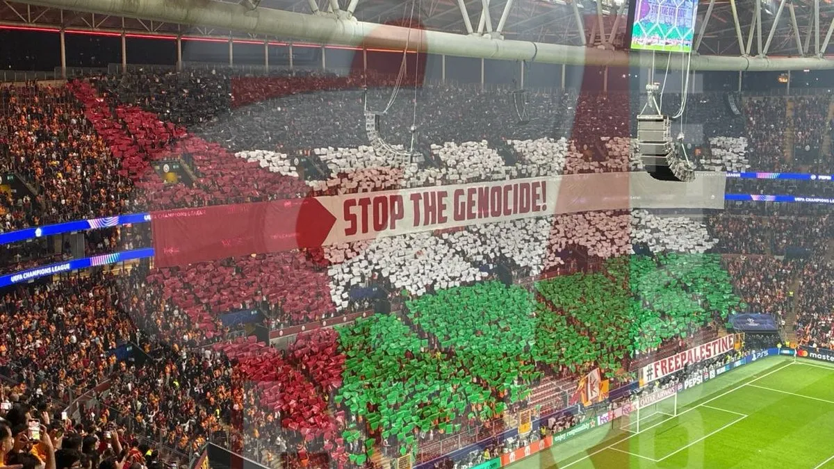 Ali Sami Yen Spor Kompleksi Rams Park'ta tribünleri dolduran Galatasaraylı taraftarlar, Filistin halkına destek amacıyla özel bir koreografi sergiledi.