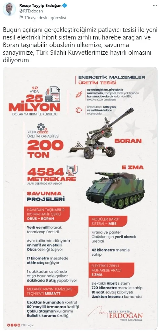 Başkan Erdoğan paylaşımında, "Bugün açılışını gerçekleştirdiğimiz patlayıcı tesisi ile yeni nesil elektrikli hibrit sistem zırhlı muharebe araçları ve Boran taşınabilir obüslerin ülkemize, savunma sanayimize, Türk Silahlı Kuvvetlerimize hayırlı olmasını diliyorum." ifadelerini kullandı.