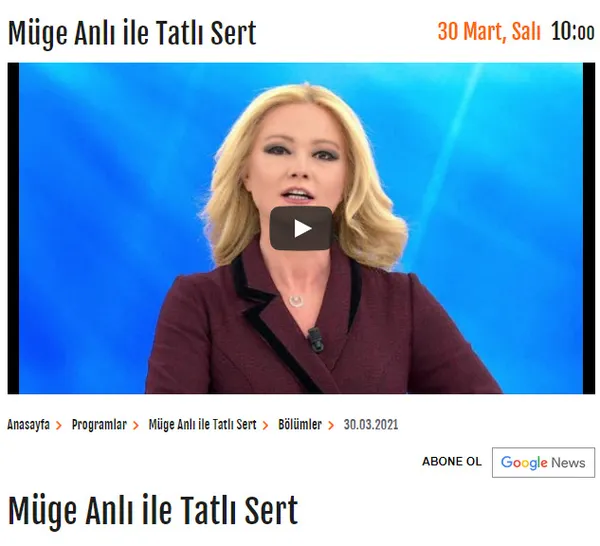 Hafta içi her gün ATV ekranında yayınlanan Müge Anlı ile Tatlı Sert programında bugün (30 Mart 2021 Salı) ne oldu? Araştırmacı gazeteci Müge Anlı'nın sunduğu programda kayıplar bulunuyor, yıllardır sır olmuş cinayetler aydınlığa çıkarılıyor.