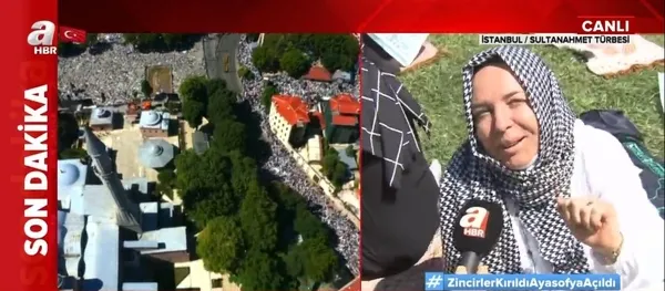 Tarihi günde binlerce vatandaş dün geceden bu yana Ayasofya Camii etrafında. A Haber muhabiri Pınar Özenç, tarihi ana dakikalar kala Sultanahmet Türbesi'nde vatandaşların sevinçlerini aktardı. Vatandaşlar Başkan Erdoğan'a teşekkürlerini ileterek "Bu Osmanlı'nın dirilişidir" ifadelerini kullandı.