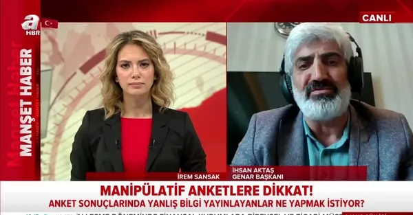 Son anketler olarak paylaşılan verilerle ilgili GENAR Başkanı İhsan Aktaş A Haber canlı yayınında değerlendirmede yaptı. Aktaş, manipülatif anketlere dikkat çekti ve bunu yapanlara tepki gösterdi.