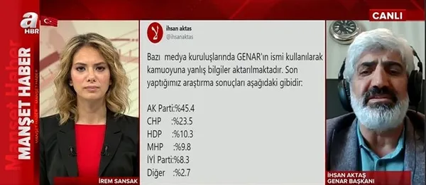 Manipülatif anketlere dikkat! GENAR Başkanı İhsan Aktaş yalana tepki gösterdi ve son anket sonucunu A Haber'de açıkladı