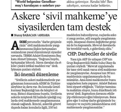 26 HAZİRAN 2009: Meclis önceki gece sabaha karşı Türk Ceza Kanunu'nda reform niteliğinde iki değişikliğe imza attı. AB normlarına uygun olarak savaş ve sıkıyönetim dışında siviller, sivil mahkemelerde yargılanacak. İkinci değişiklikse, özetle darbeci askerlerin de sivil mahkemede yargılanması yolunu açtı.