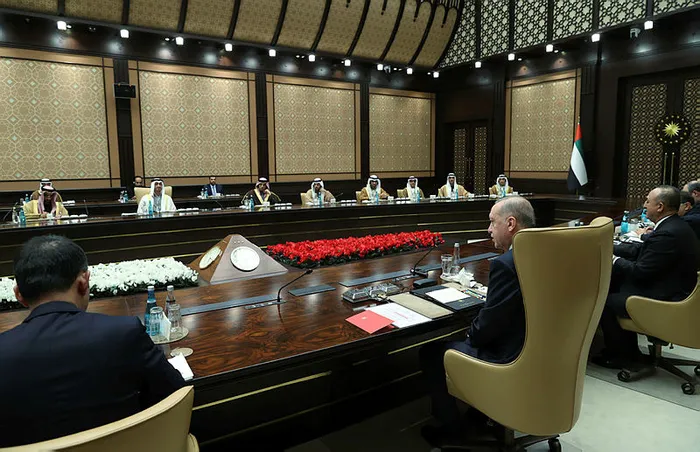 Başkan Recep Tayyip Erdoğan ve Abu Dabi Veliaht Prensi Şeyh Muhammed bin Zayed El Nahyan'ın huzurunda imzalanan 10 anlaşmanın ardından Abu Dabi Kalkınma Holdingi (ADQ) Yönetim Kurulu Başkanı Mohamed Hasan Al Suwaidi, basın toplantısı düzenledi.