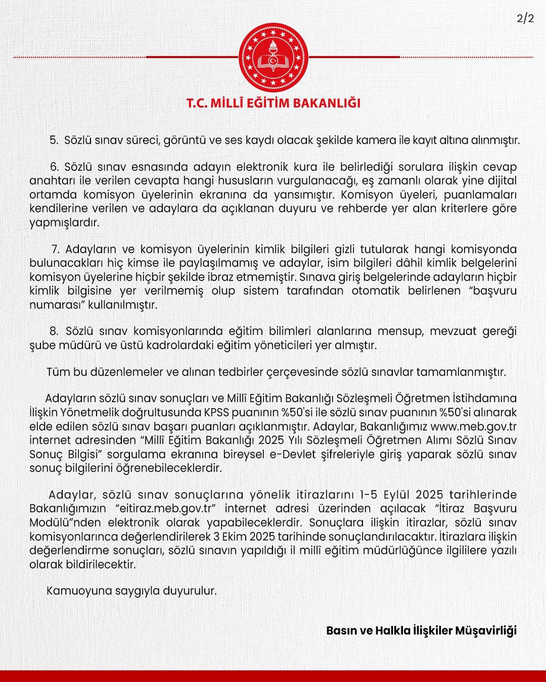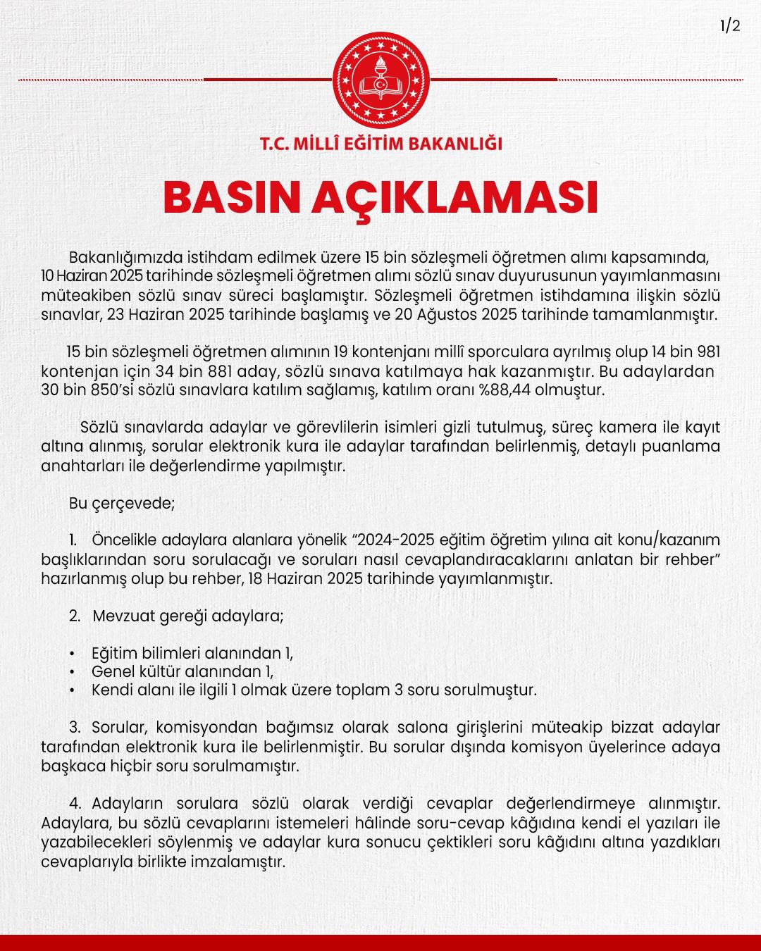 "15 Bin Sözleşmeli Öğretmen İstihdamı Kapsamındaki Sözlü Sınav Sonuçlarına İlişkin Basın Açıklaması