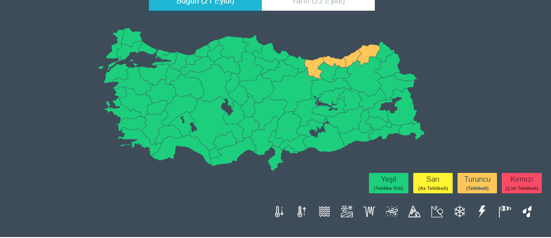 Afet ve Acil Durum Yönetimi Başkanlığı (AFAD), özellikle Rize, Giresun, Trabzon ve Artvin illeri için turuncu kodlu gök gürültülü sağanak uyarısı yaptı. Bölgede iki gündür devam eden aşırı yağışlar nedeniyle sel, taşkın ve toprak kaymaları meydana geldi. AFAD tarafından yapılan açıklamada, Meteoroloji Genel Müdürlüğü'nden alınan veriler doğrultusunda bu illerde olası olumsuzluklara karşı dikkatli olunması istendi.