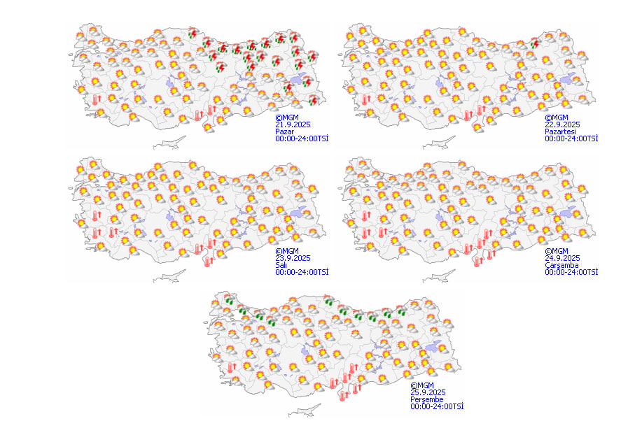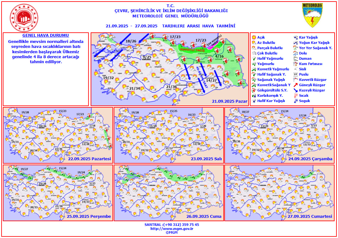 Meteoroloji Genel Müdürlüğü tarafından yapılan son değerlendirmelere göre, ülkemizin kuzey ve doğu kesimleri parçalı, yer yer çok bulutlu bir hava yaşayacak. Özellikle Orta Karadeniz kıyıları ile Tokat ve Sinop, Doğu Karadeniz'in tamamı ve Doğu Anadolu'nun kuzey ve doğu bölgelerinde aralıklı sağanak ve gök gürültülü sağanak yağışlar bekleniyor. Diğer bölgelerde ise hava az bulutlu ve açık olacak.