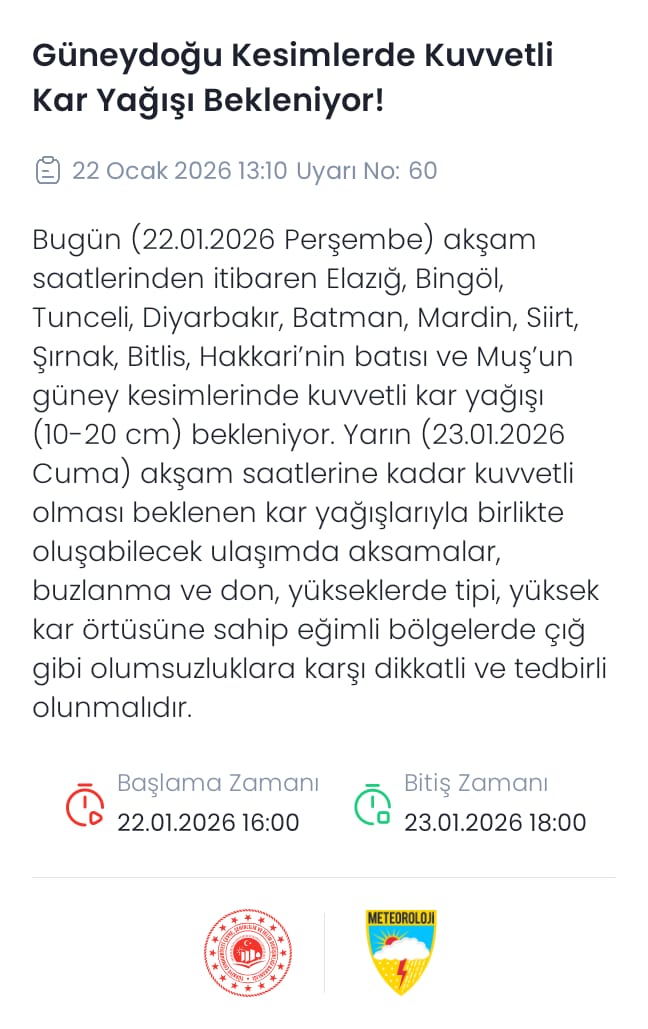 Toroslar'da kar yağışının devam ettiğini aktaran Tek, günün ilerleyen saatlerinde sistemin Güneydoğu Anadolu'ya doğru hareket edeceğini belirtti. Gaziantep, Kahramanmaraş, Adıyaman, Malatya ve Şanlıurfa'nın kuzey kesimlerinde öğle saatlerinden sonra kuvvetli kar yağışı beklendiğini vurguladı.