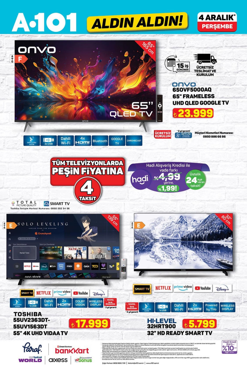 A101'in 4 Aralık tarihli aktüel ürün kataloğu açıklandı. Bu hafta da A101 geniş ürün yelpazesiyle tüketicilerin ilgisini çekiyor. Yılbaşı ürünlerinden mutfak araç gereçlerine kadar pek çok kategoride fırsat ürünleri listede yerini aldı.