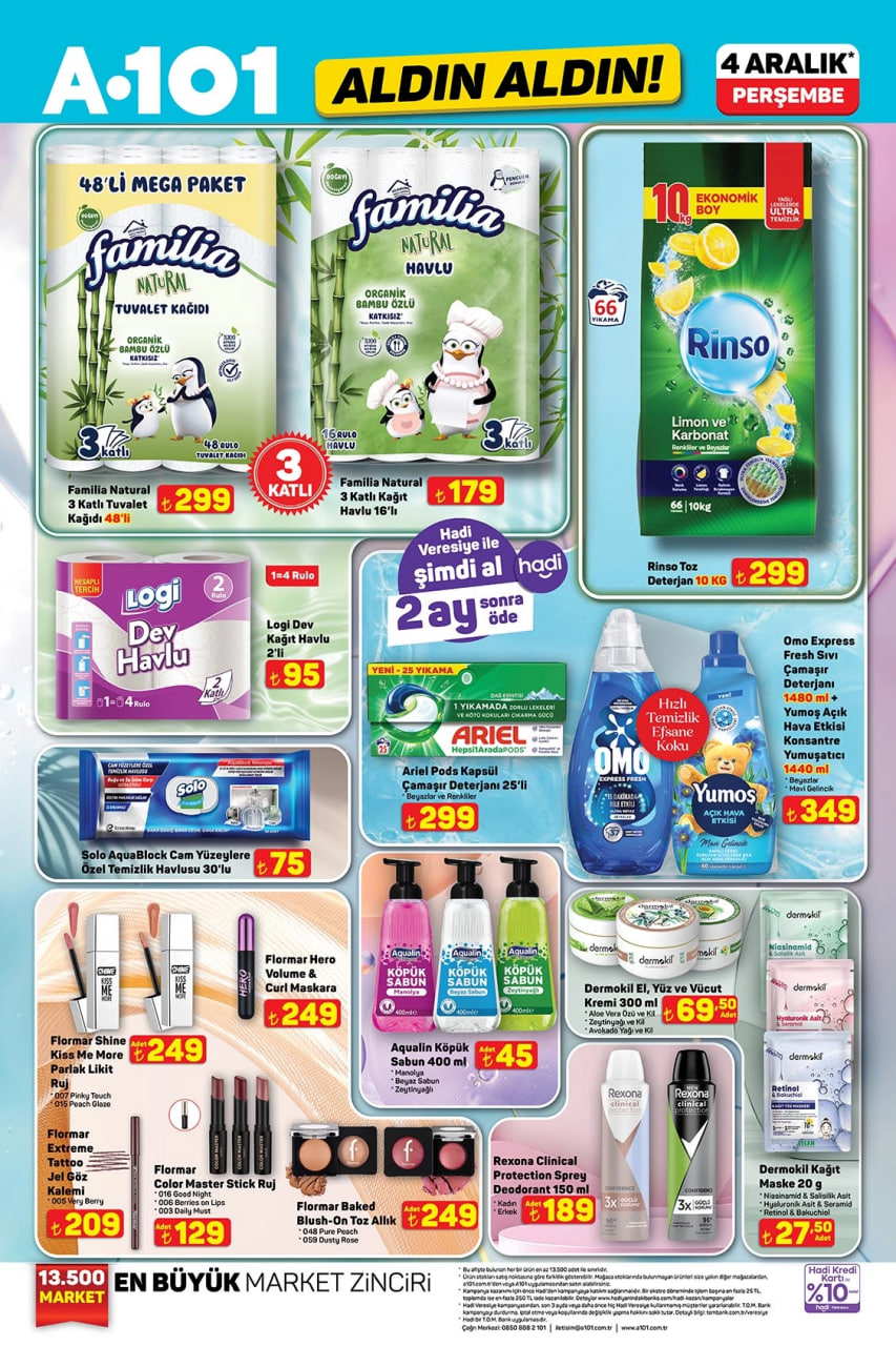 A101, 4 Aralık Perşembe günü geçerli olacak yeni aktüel kataloğunu yayımladı. Aralık ayına indirimlerle başlayan market zinciri, farklı ihtiyaçlara hitap eden ürünlerini bu hafta da avantajlı fiyatlarla müşterilerine sunuyor. Özellikle yılbaşı hazırlığını erkenden yapmak isteyen tüketiciler, yeni katalogda yer alan özel ürünleri ve kampanyaları yakından takip ediyor.