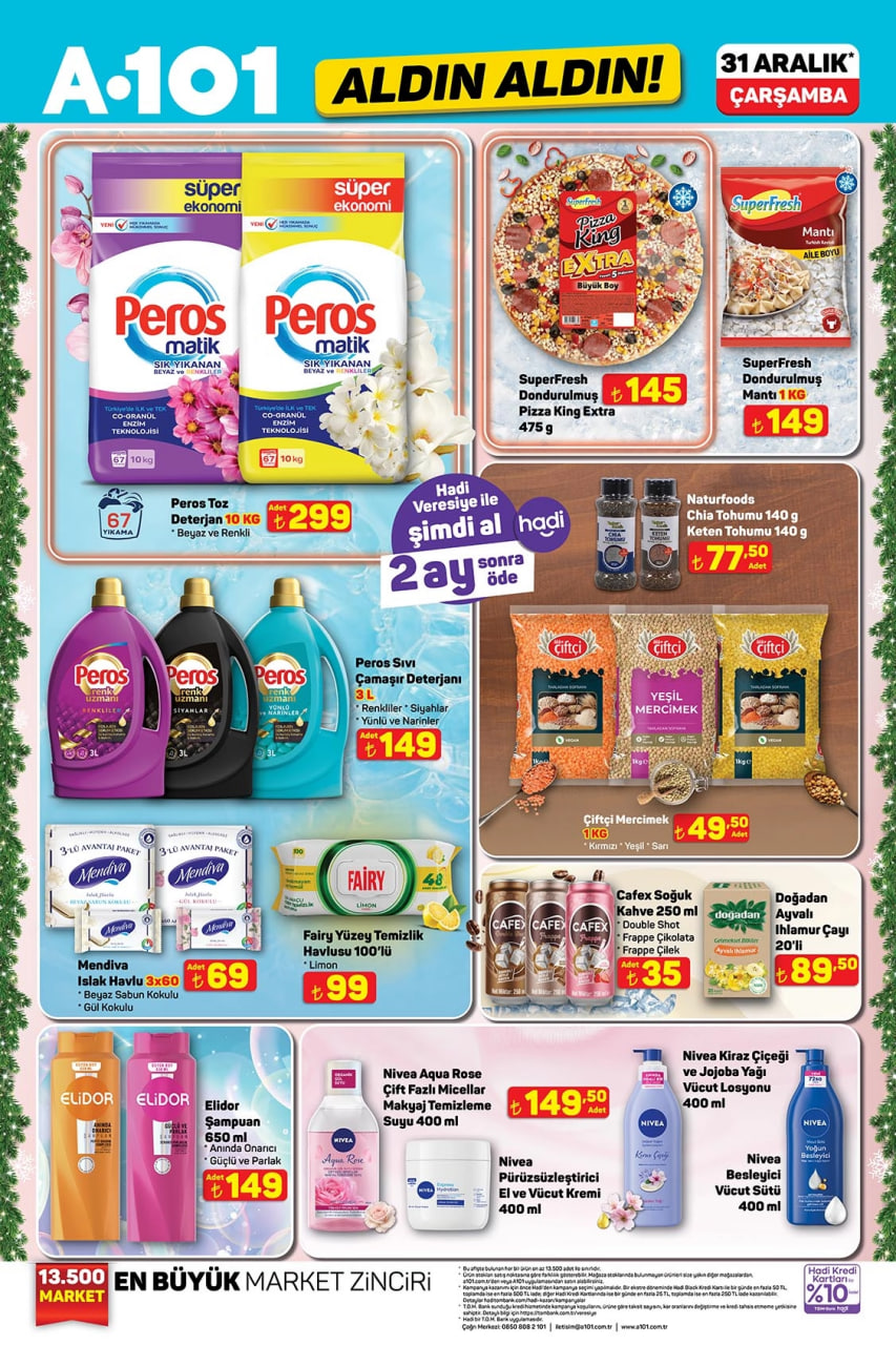 A101'in 31 Aralık Çarşamba gününe özel Aldın Aldın aktüel kataloğu duyuruldu. Yılın son gününde mağazalarda beyaz eşyadan elektroniğe, ev ve mutfak ürünlerinden tekstil ve gıdaya kadar birçok seçenek yer alıyor. Sınırlı sayıda sunulacak ürünler şimdiden merak konusu oldu.