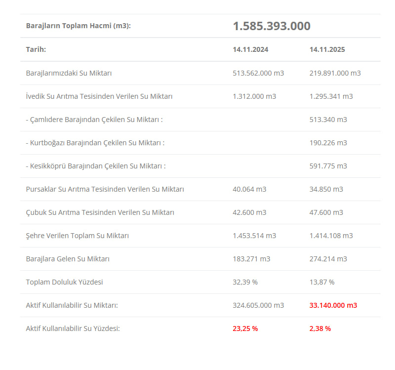 BUSKİ güncel verilerine göre, şehrin içme suyu kaynağını sağlayan barajlarda su miktarı kritik seviyenin altına indi. Yıl genelinde dalgalı bir seyir izleyen baraj doluluk oranı, mayıs ayında yüzde 55,84 ile yılın en yüksek seviyesine çıkarken, kasım ayı itibarıyla yüzde 0'a kadar geriledi.