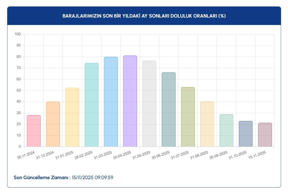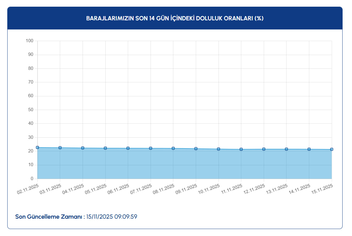 İSKİ'nin son açıkladığı verilere göre, 15 Kasım 2025 itibarıyla megakentteki barajların genel doluluk oranı yüzde 21,38 olarak ölçüldü.
