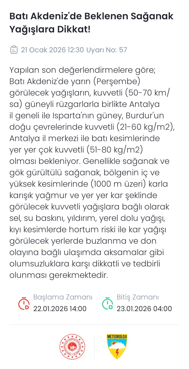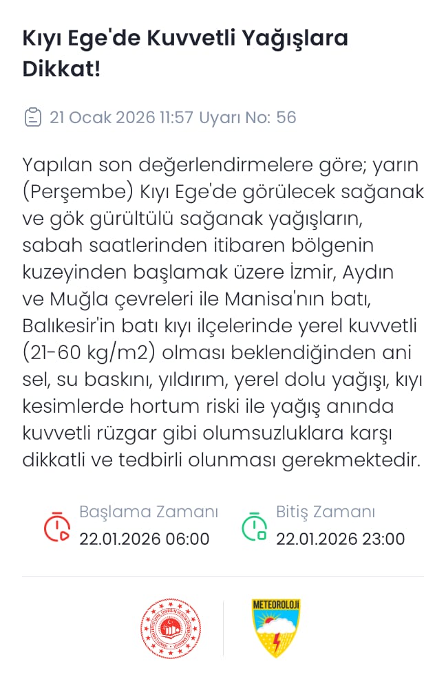 Meteoroloji Genel Müdürlüğü, kuvvetli rüzgar ve fırtına nedeniyle Ege ve Akdeniz'de alarm verdi. Aydın, İzmir ve Muğla için sarı kodlu uyarı yayımlanırken, Kuzey Ege, Güney Ege, Batı Akdeniz ve Doğu Akdeniz genelinde rüzgarın yer yer fırtına ve kuvvetli fırtına şeklinde etkili olmasının beklendiği bildirildi.