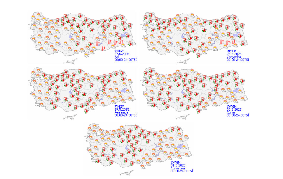 Meteoroloji Genel Müdürlüğü'nün son hava tahminlerine göre Türkiye genelinde parçalı ve çok bulutlu hava hakim olacak. Marmara'nın kuzeybatısı, Doğu Akdeniz'in iç kesimleri, Adana çevresi, İç Anadolu'nun doğusu ile Karadeniz ve Doğu Anadolu'nun kuzeydoğu bölgelerinde aralıklı sağanak ve gök gürültülü sağanak yağışlar bekleniyor. Özellikle Batı Karadeniz'in doğusu ile Yozgat, Çankırı ve Çorum çevrelerinde yağışların yer yer kuvvetli olması tahmin ediliyor.