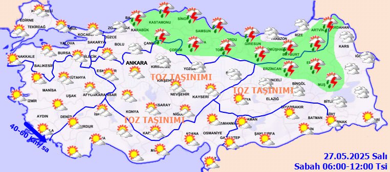 Meteoroloji yetkilileri, Akdeniz, İç Anadolu, Orta ve Doğu Karadeniz ile Doğu ve Güneydoğu Anadolu bölgelerinde toz taşınımı beklendiğini duyurdu. Toz taşınımı hava kalitesini olumsuz etkileyebileceği için vatandaşların ve özellikle solunum rahatsızlığı olanların dikkatli olması öneriliyor.