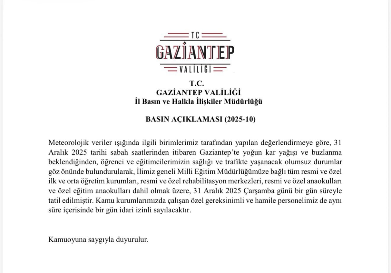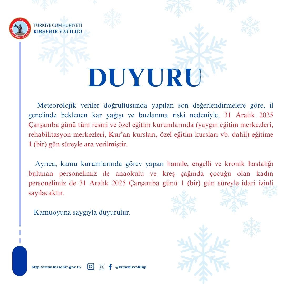 Yozgat'ta olumsuz hava koşulları nedeniyle kent merkezinde bugün öğleden sonra eğitime ara verildi. Valilikten yapılan açıklamada, sabah saatlerinden itibaren etkili olan kar yağışının ulaşımda riskler oluşturabileceği belirtilerek, tedbir amacıyla il merkezi ve merkeze bağlı köy okullarında 31 Aralık 2025 günü öğleden sonra eğitim öğretime ara verildiği duyuruldu. Açıklamada ayrıca, kamuda çalışan engelli ve hamile personel ile okul öncesi eğitim kurumları ve rehabilitasyon merkezlerinde çocuğu bulunan annelerin idari izinli sayılacağı ifade edildi.